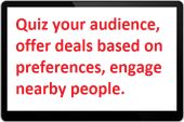 GUESSING GAMES Appeal to shoppers' curiosity by asking them to guess "What's Behind the Curtain?". In this game, players are asked to select from a set of choices and rewarded with coupons for winning. A bar could play a "Dating Game" asking patrons to match interests with avatars.